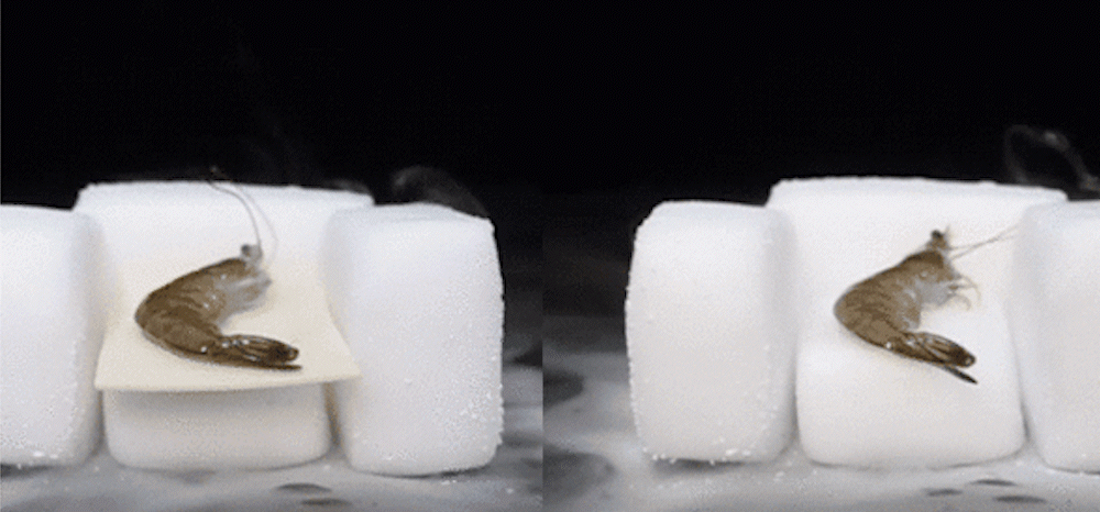 エアロゲル素材の上に海老を置き断熱性のテストをしました。結果はエアロゲル素材の上に置いた海老は直接ドライアイスの上に置いた海老よりも柔らかく冷気が伝わっていない事がわかります。