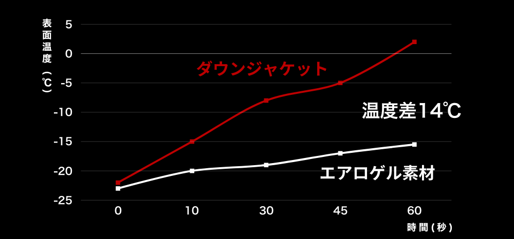 エアロゲル素材は過酷な氷点下20℃の環境下でも表面温度を高めずに内側の保温力を十分にキープします。